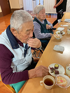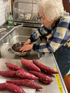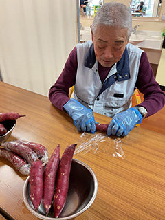 お昼のおかずにもう一品。ポテトサラダ作りを行いました。ジャガイモをつぶしたり、ハムを切ったりと皆様参加され、美味しいポテトサラダが出来上がりました。