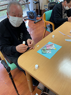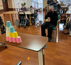 日常のレクリエーションでは紙コップからピンポン玉を発射し的に当てるゲームを行い、盛り上がっていました。